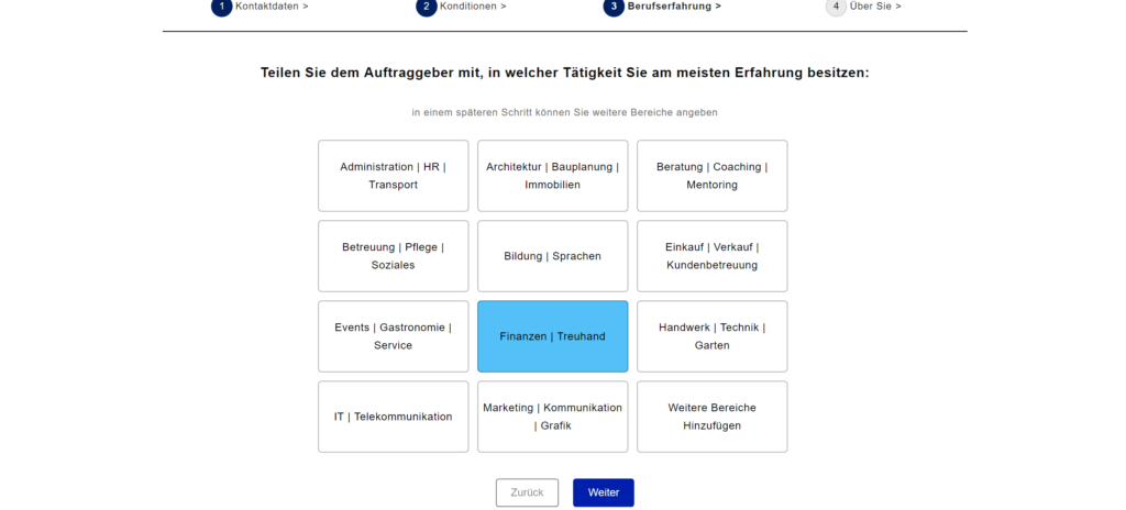 Zuletzt können Sie nun angeben, in welchen weiteren Bereichen Sie Auftraggeber mit ihrer Erfahrung unterstützen möchten. Dazu zählen auch Wissen aus ausserberuflichen Tätigkeiten, wie Ehrenämter oder Hobbies.