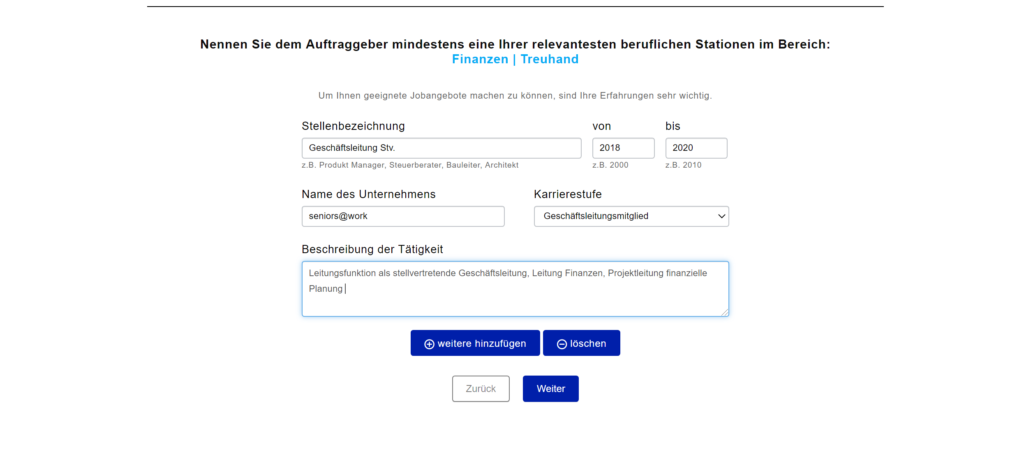 Um Ihnen geeignete Jobs anzubieten, ist es für Auftraggeber wichtig zu wissen, welche konkreten Aufgaben Sie in der Vergangenheit ausgeübt haben. Geben Sie deshalb mindestens eine Stellenbezeichnung Ihrer letzten beruflichen Station an. Unten haben Sie die Möglichkeit, weitere relevante Positionen anzugeben.